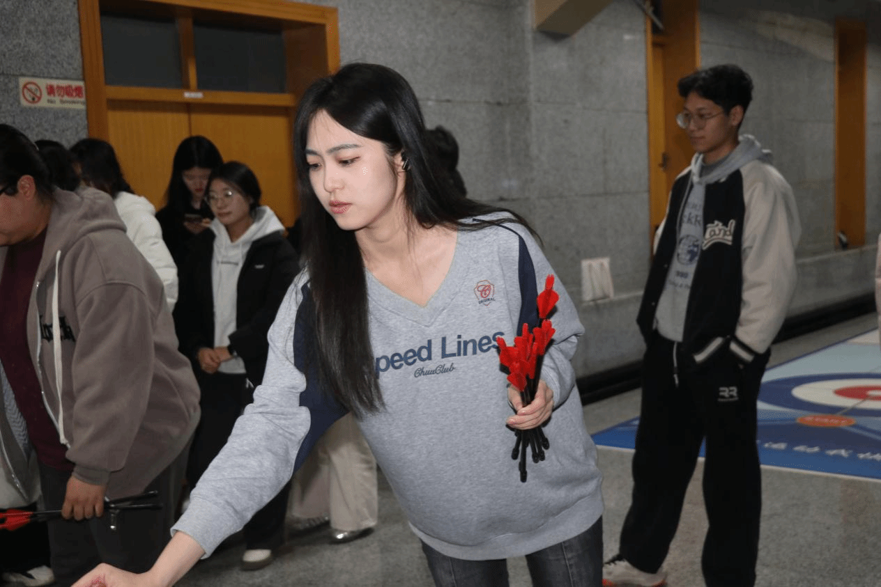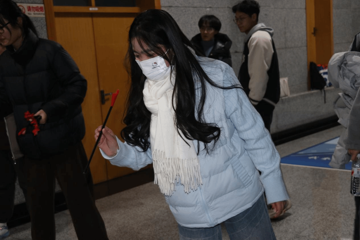 比赛现场,壶具静置于场地中央。规则简单直接:每人十支箭,投中一箭记一分。投壶动作看似简单,但要找准角度与力道,还真需要一番琢磨。八位同学轮番上阵,或沉稳慎重,或轻松抛掷,场馆里充满了期待的静谧与命中的欢呼。