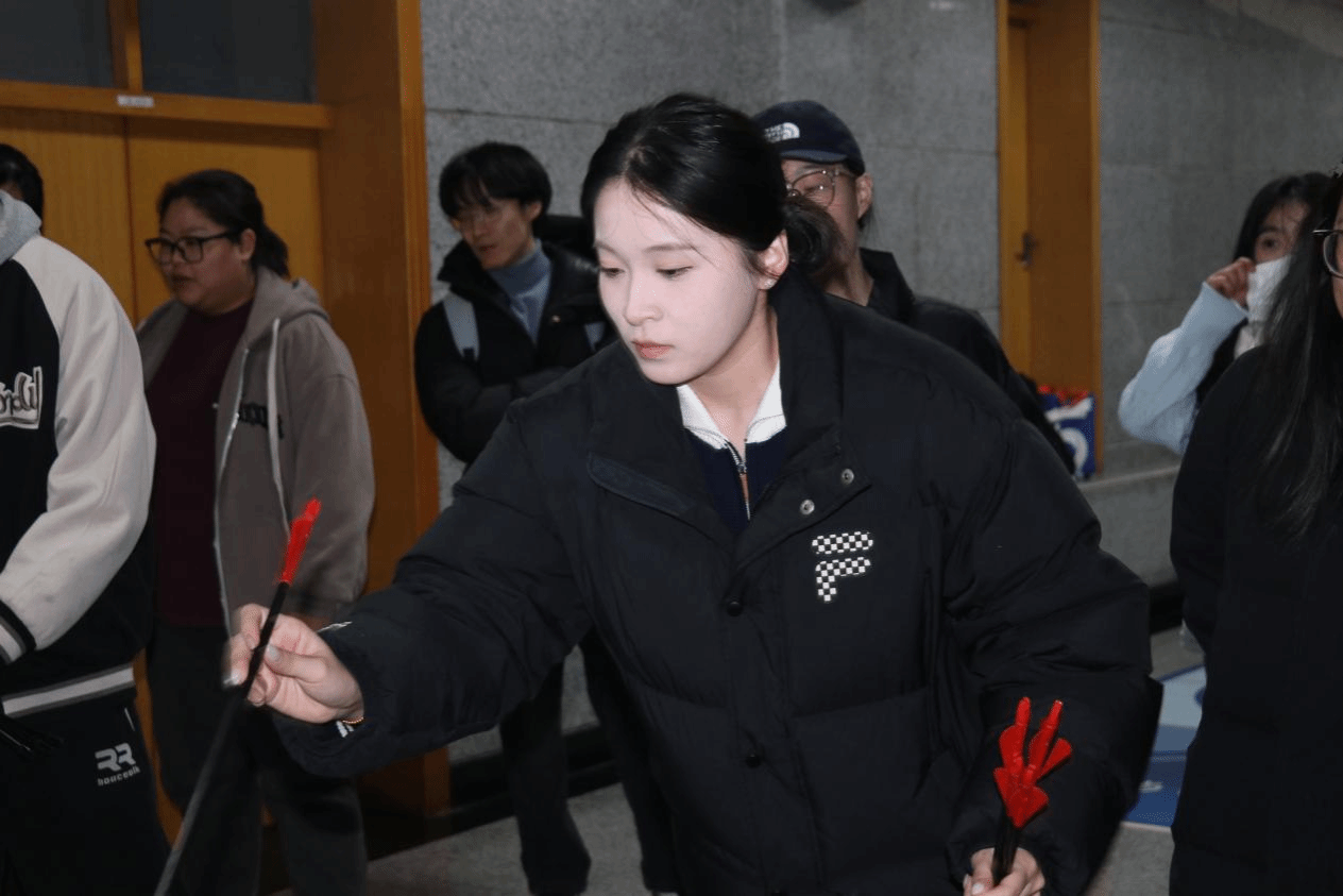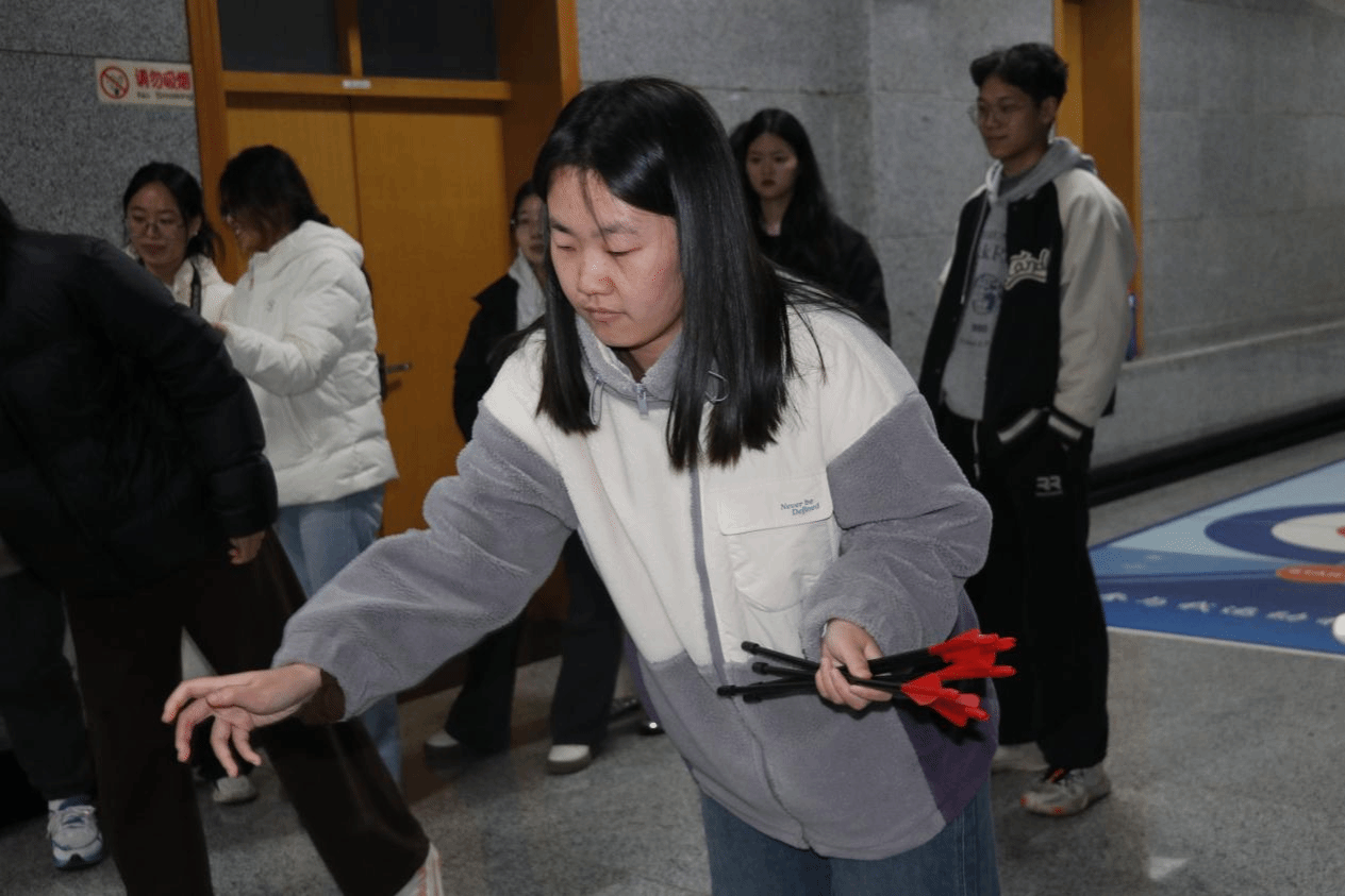 每一箭命中,都伴随着同伴们的掌声与鼓励,场面激动又热烈。最激动人心的时刻来自王炀同学——她站在投掷线前,屏息凝神,手腕轻扬。第一箭入壶!紧接着第二箭、第三箭……箭矢一支接一支精准落入壶中!当第七支箭“叮当”一声稳稳落定时,同学们不约而同地发出“哇!”的惊呼,随后爆发出热烈的掌声与喝彩声。