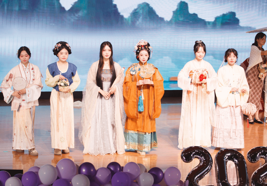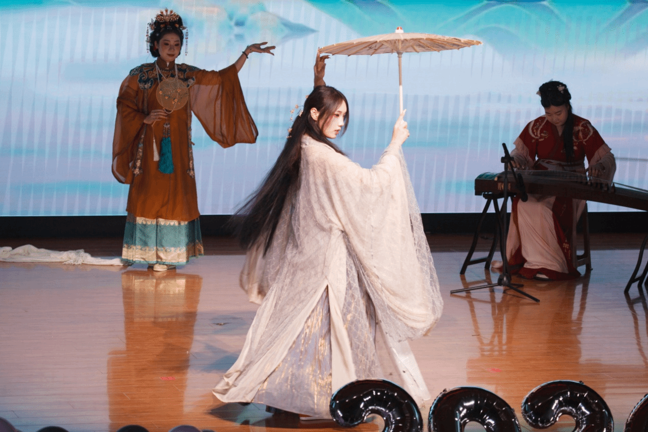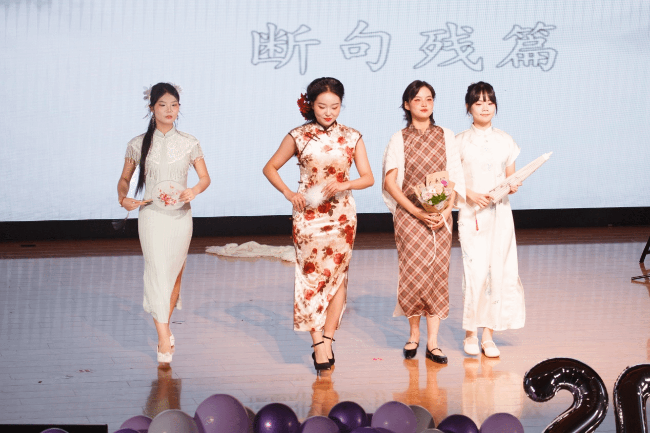 学院2024级哲学专业本科生康静怡等15位同学带来的走秀《华夏霓裳・锦绣千年》惊艳全场。汉服的古韵庄重与旗袍的优雅温婉在舞台上完美呈现,同学们身着传统服饰款款走来,仿佛带领观众穿越千年时光长廊,沉浸式感受传统服饰的绝美风姿与深厚文化底蕴。