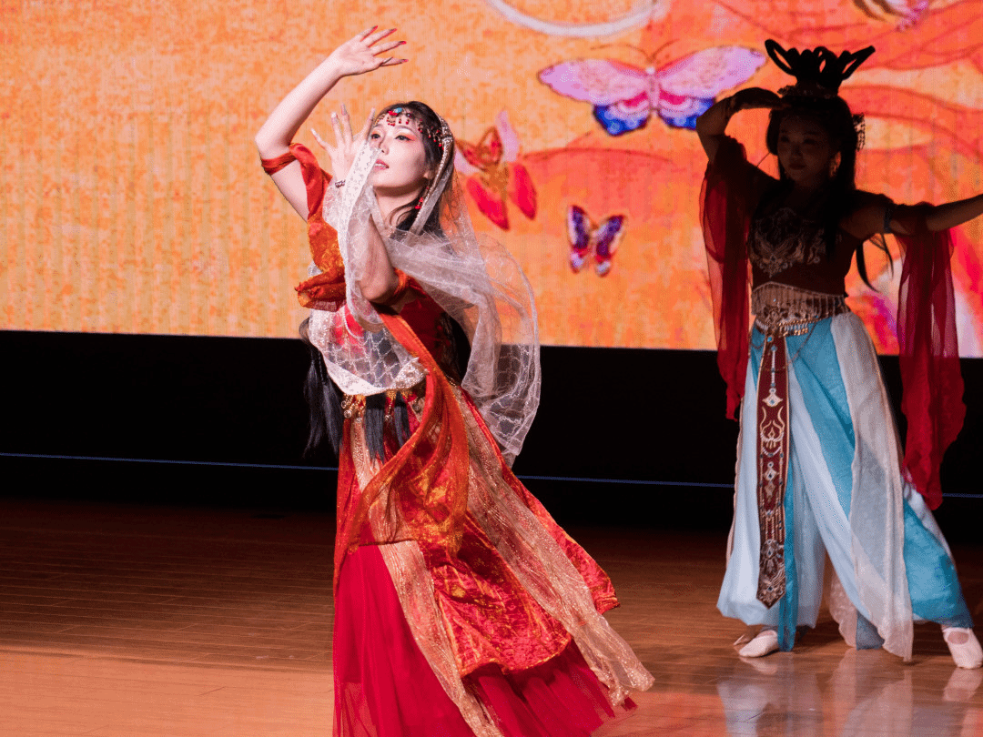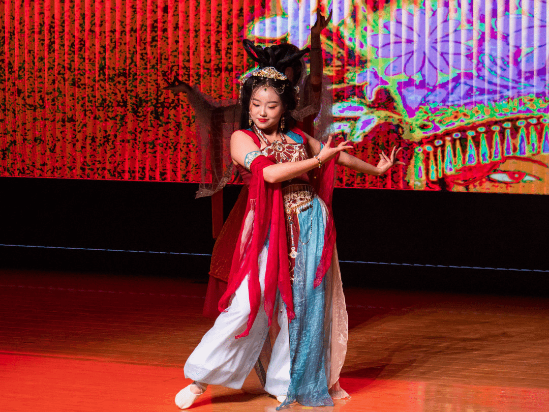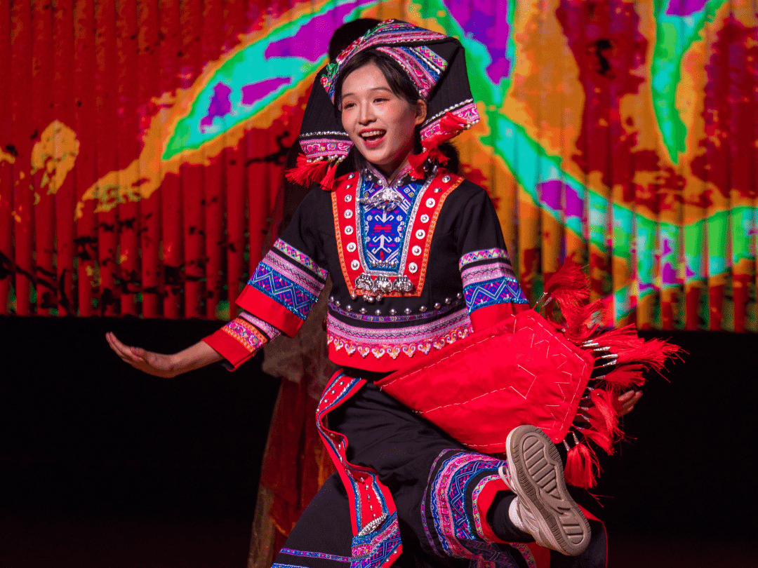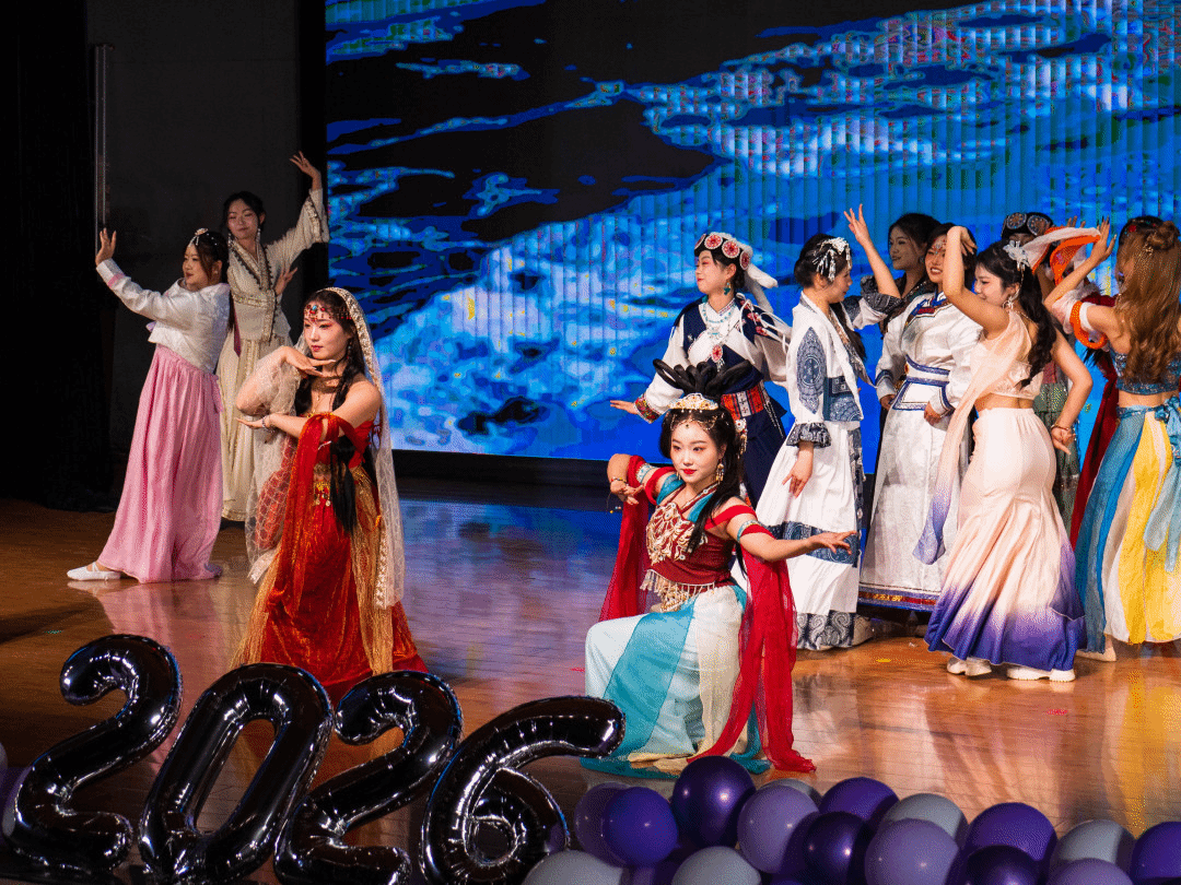 敦煌飞天的飘逸、维吾尔族舞步的灵动、壮族铜鼓的豪迈、傣族孔雀的温婉、朝鲜长鼓的轻快,在舞蹈《六彩和韵》中完美交融。学院2024级哲学专业本科生张紫涵、2025级哲学专业本科生马佳悦领衔15位同学,以翩跹舞姿勾勒出一幅绚丽多彩的民族团结画卷,用昂扬旋律传递“民族团结一家亲”的深厚情谊,共贺家国安康团圆。