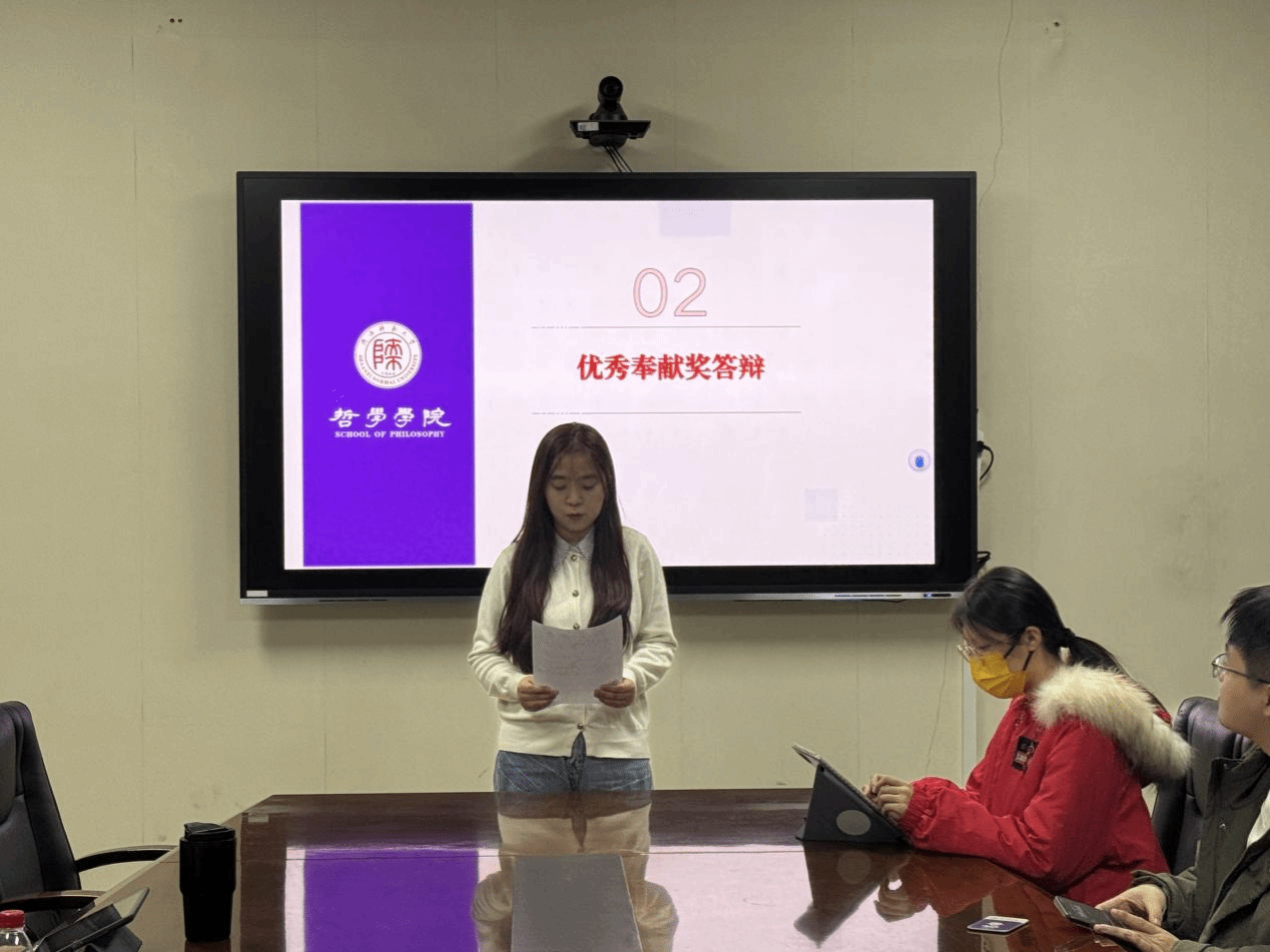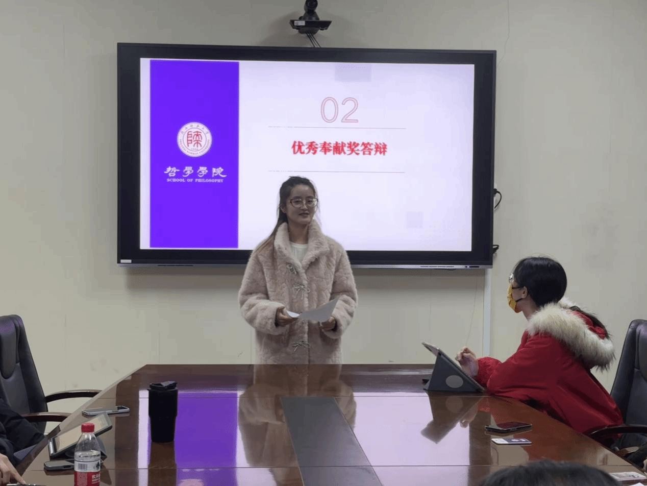 随后开展“优秀奉献奖”答辩环节,杨雅雯、周文欣、张雨欣、张娜娜、瞿爱韫五位同学依次走上台前,将个人成长与集体服务的故事娓娓道来。她们的讲述中,有伏案工作的细致,有组织活动的热忱,有专业实践的探索,更有对奉献价值的深沉思考。