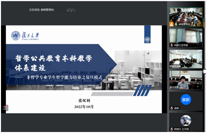复旦大学哲学学院副院长、哲学系主任张双利教授以“哲学公共教育本科教学体系建设——非专业学生哲学能力培养之复旦模式”为题展开报告。张老师从成果简介、所解决主要问题、成果创新点、成果推广应用情况四个方面对复旦大学的哲学通识教育进行了详实的报告。他指出,哲学教育能够帮助非哲学专业的学生形成抽象思维能力、面对真实问题的综合理解和判断能力。“新文科”教育背景下,“新理科”、“新工科”人才需要有哲学教育给予的综合能力,才能成为引领性创新人才。以此为基础,复旦大学搭建了国内首个哲学公共教育体系,通过这个三阶两维的课程体系,在不增加学分的前提下,设置有梯度的体系结构,使学生们获得学习的纵深感。随后,张老师展示了经过20多年的建设后形成的哲学公共教育复旦模式所取得的优异教学效果。