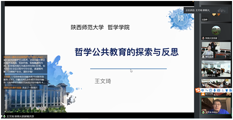 陕西师范大学哲学书院通识教育中心副主任王文琦老师对陕师大哲学公共教育的探索经验进行报告,报告题目为“哲学公共教育的探索与反思”。王老师指出,陕师大哲学公共教育主要依靠关学研究院和哲学书院两翼齐飞,关学研究院提供学术指导和教育输出,哲学书院负责实践推广与人才培养。同时辅之以线上通识课程、学术讲座的方式的推广传播。最后,王老师做出了对哲学公共教育发展的思考,指出一方面要重视道、政、学的融合,另一方面要探寻与开发教育之外的教养和教化功能。同时,王老师认为纯学术的研究可能无法完全深入哲学家人生哲学的堂奥,需要借助文化上潜移默化的力量。