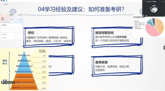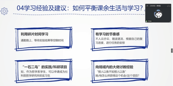 最后,琬潼学姐根据自己的经验经历,就“如何平衡课余生活与学习”和“如何准备考研”两个问题给出自己的建议——前者可以利用碎片化时间学习、培养学习的节奏感、参与“一石二鸟”的实践或科研项目、向场域内的大佬讨教经验……后者则可以通过择校、指定短期目标、善用资源等方式。