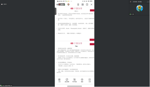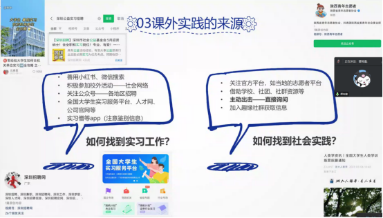 在第三部分中,琬潼学姐向我们讲述如何获得课外实践,这里的“课外实践”主要分为“实习工作”和“社会实践”两个部分,学姐分别向我们简述了如何找到实习工作和如何找到社会实践。