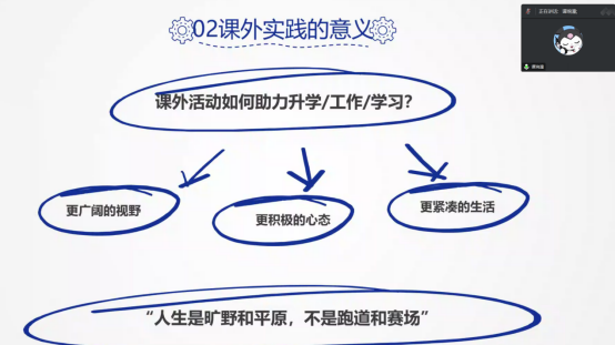 接着,在第二部分中,琬潼学姐以自己的经历,讲述大学本科期间进行课外实践的意义,她认为课外实践可以给同学们带来更广阔的视野、更积极的心态、更紧凑的生活,从而可以助力升学、工作或学习。