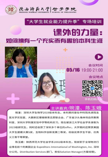 为丰富大学生活,拓展信息来源,提高大学生就业能力,我校哲学学院举办“大学生就业能力提升季”专场培训,本次会议以“课外的力量:如何拥有一个充实而有趣的本科生涯”为题,邀请到琬潼、陈玉娥两位嘉宾,请她们进行本科生学习生活的经验分享。本次会议于5月16日以线上形式召开,由社会学系李卫东老师主持,哲学学院副书记李晔老师、社会学系陈玉佩老师以及社会学系20级、21级、22级全体学生参与。