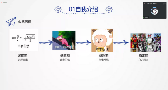 会议进入经验分享环节后。首先由琬潼学姐发言,发言内容主要分为四个部分,分别是自我介绍、课外实践的意义、课外实践的来源和学习经验及建议。在第一部分自我介绍的环节,琬潼学姐讲述了自己大学本科期间从迷茫、无所事事到稳定、确定目标的心路历程,拉近了与同学之间的距离,也引入了关于课外实践的话题。