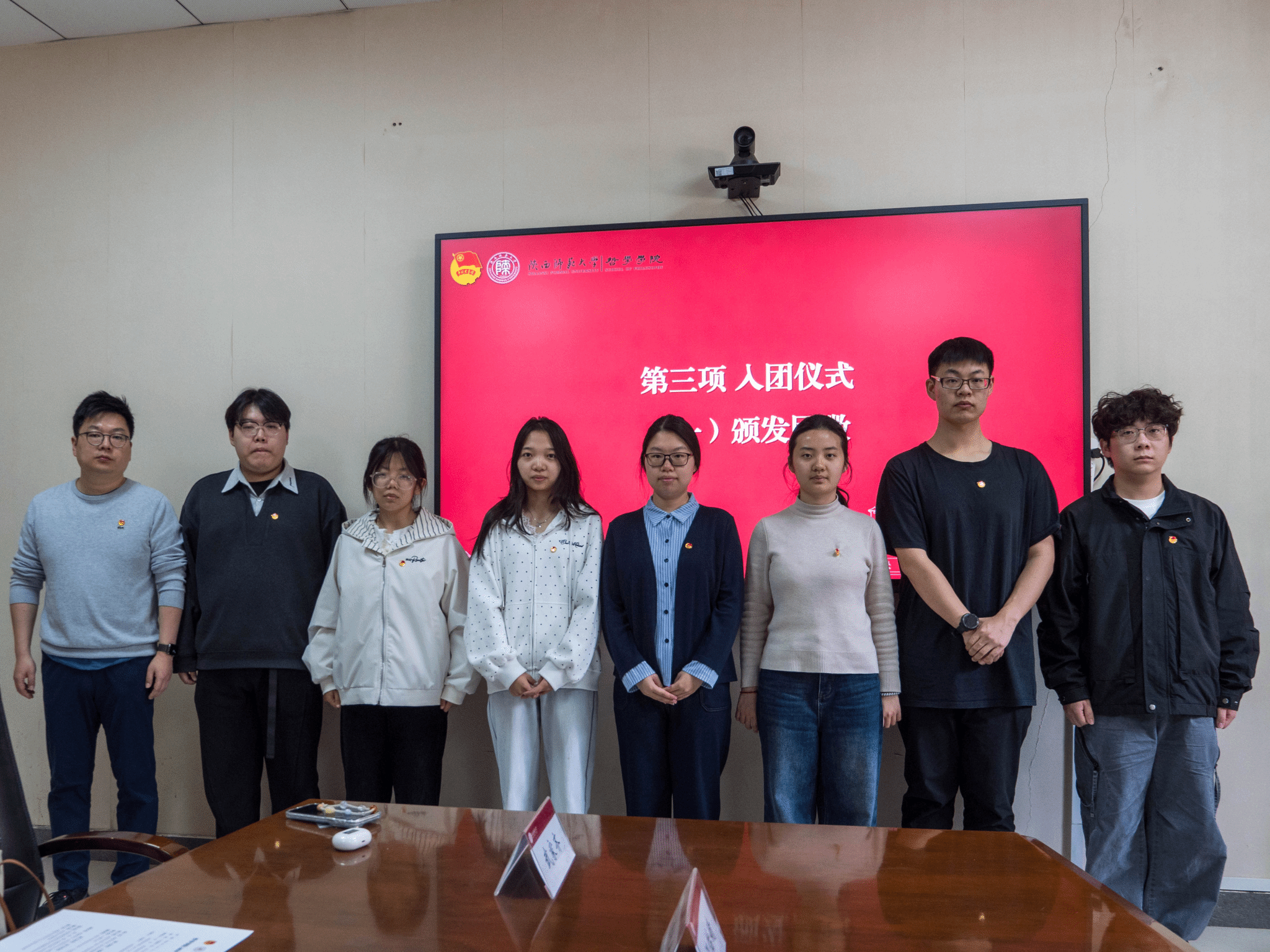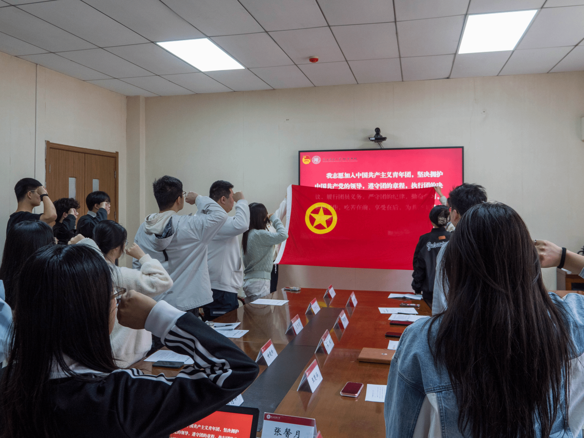 入团宣誓环节,老师为新团员郑重颁发并佩戴团徽,熠熠生辉的团徽缀于胸前,是荣誉的象征,更是责任的嘱托。随后,学院学生团委副书记汪怡婧带领全体新团员面向团旗,高举右拳庄严宣誓,铿锵有力的誓言响彻会场,字字句句凝聚着新团员为共产主义事业奋斗终身的坚定信念。